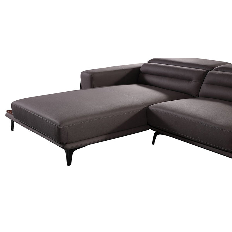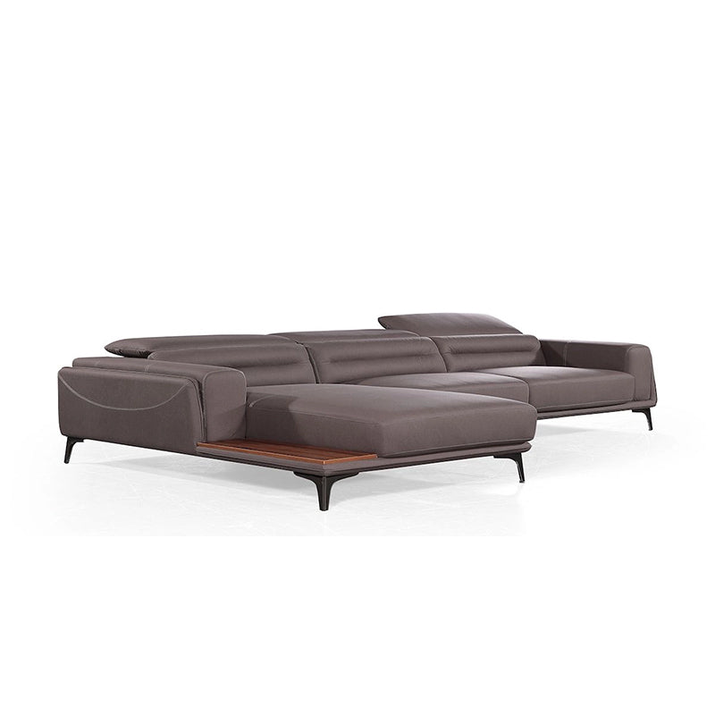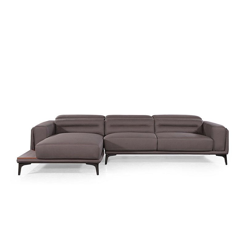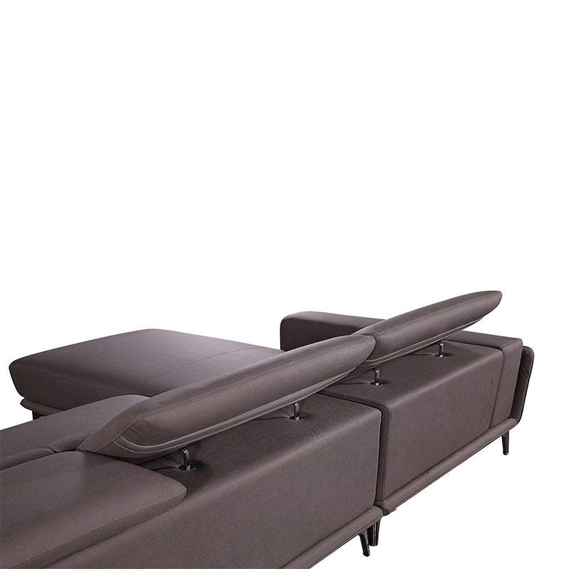 This contemporary leather sofa balances comfort and function with a refined sculptural profile. Designed with broad armrests, adjustable headrests, and sleek chrome legs, it offers a floating visual lightness perfect for sophisticated interiors. The integrated black gloss side tray adds everyday utility while maintaining a minimalist silhouette. Wrapped in luxurious genuine leather and detailed with structured tufting, this sofa brings modern elegance into lounge spaces, making it ideal for urban homes seeking practical features with premium styling.
