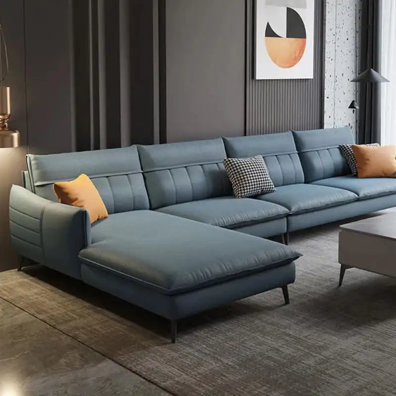 The Kaviel sectional blends Scandinavian poise with contemporary charm. This L-shaped luxury sofa showcases a streamlined silhouette, stitched horizontal lines, and plush cushions for deep seating comfort. Crafted as a 5-seater lounge sofa, it transitions easily between corner couch and lounger sofa configurations. Ideal for modern homes seeking a refined yet relaxed aesthetic, its balanced geometry and premium fabric upholstery embody sophisticated comfort for today’s urban living.